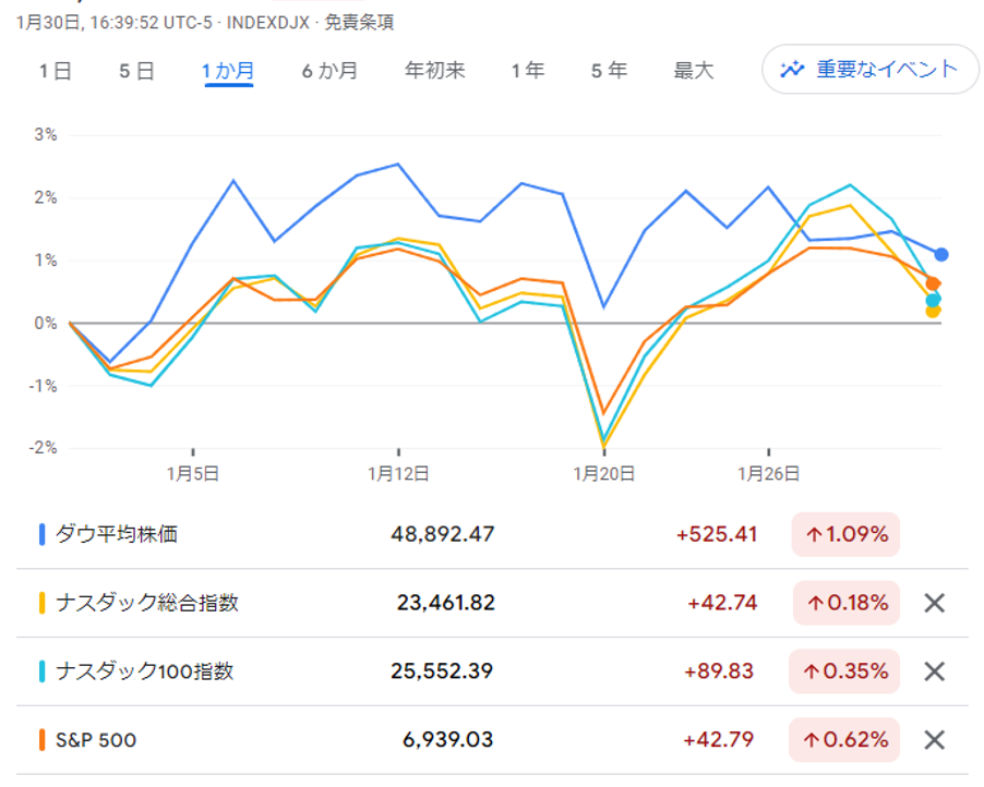 | NYダウ | 48,063.29 | 48,892.47(+1.73%) |