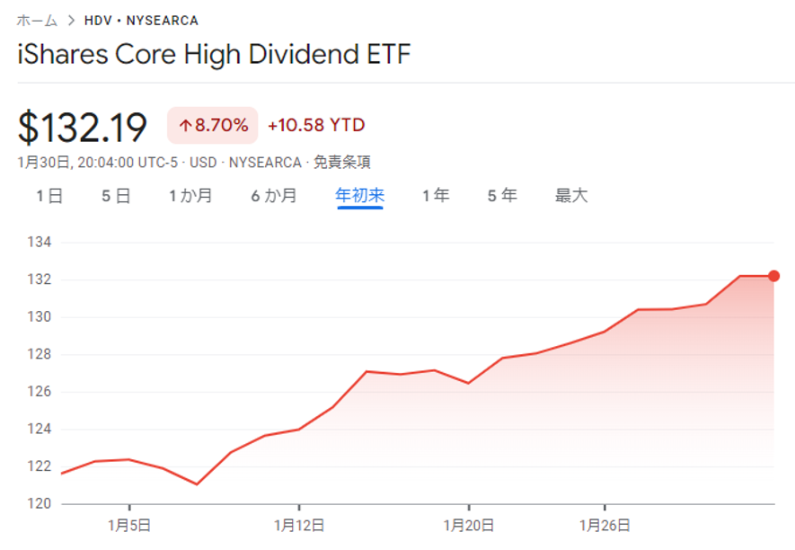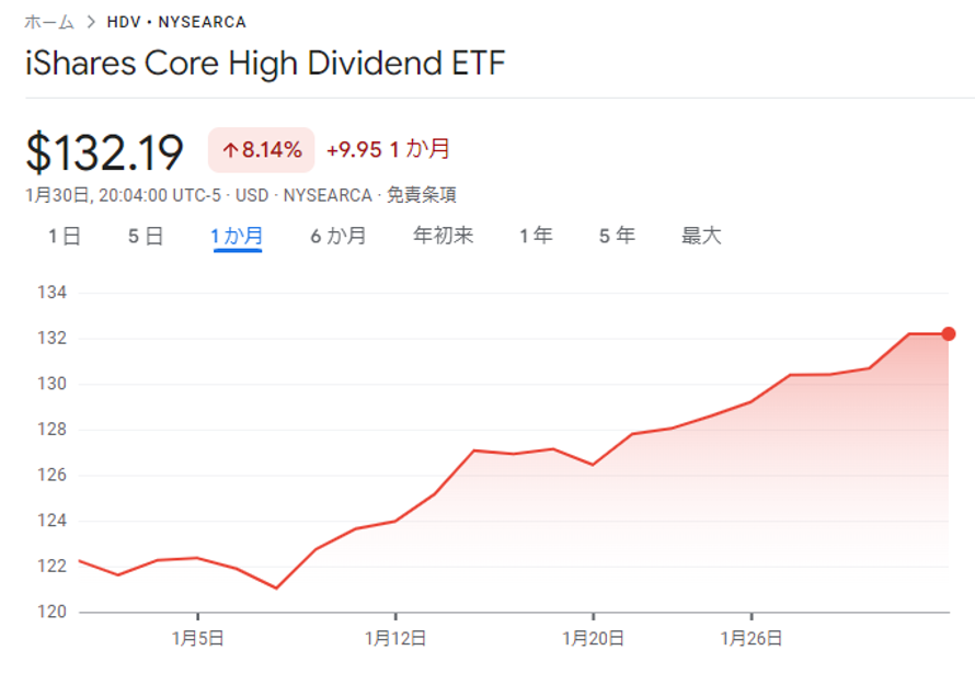 高配当ETFは分配金を出す反面、キャピタルゲインは少しずつしか増えていかない感じですが、1月は大きく上昇しました。指数とは違った動きをするので、分散という意味では持つ意味があるかもですね。
