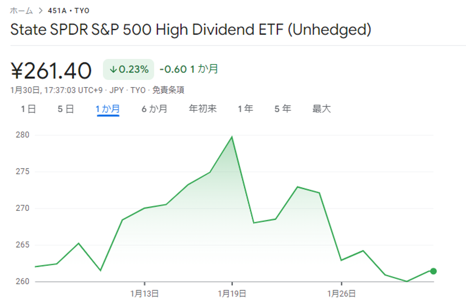 円換算では、東証ETF「ステート・ストリート・スパイダー S&P500 高配当株ETF」(451A)のチャートになります。