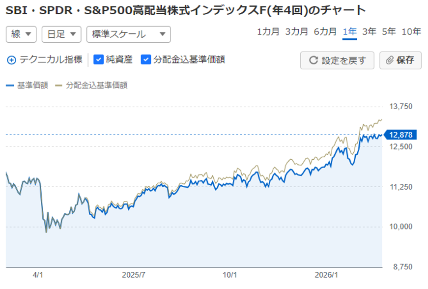 円換算の1年チャートは「SBI・SPDR・S&P500高配当株式インデックスF(年4回)」のチャートを使用します。