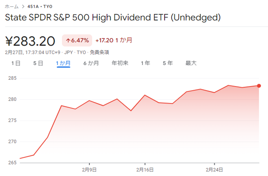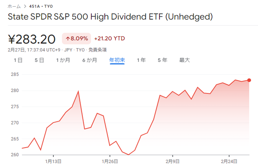 円換算では、東証ETF「ステート・ストリート・スパイダー S&P500 高配当株ETF」(451A)のチャートになります。