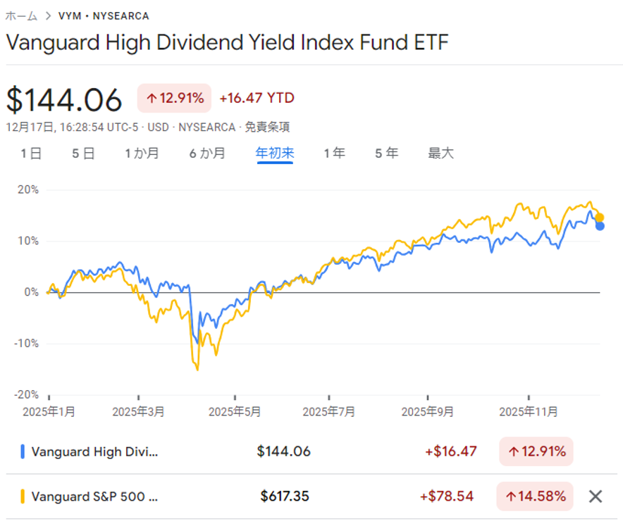 見ての通り、S&P500のVOOは14.58%程度上昇している一方、VYMも、13%弱の上昇で、同じくらいのパフォーマンスですね。