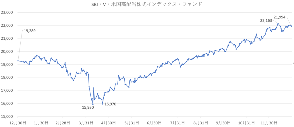 なお、このチャートは「SBI-SBI・V・米国高配当株式インデックス・ファンド」の過去1年の数字で、配当も再投資された結果となっていることにご留意ください
